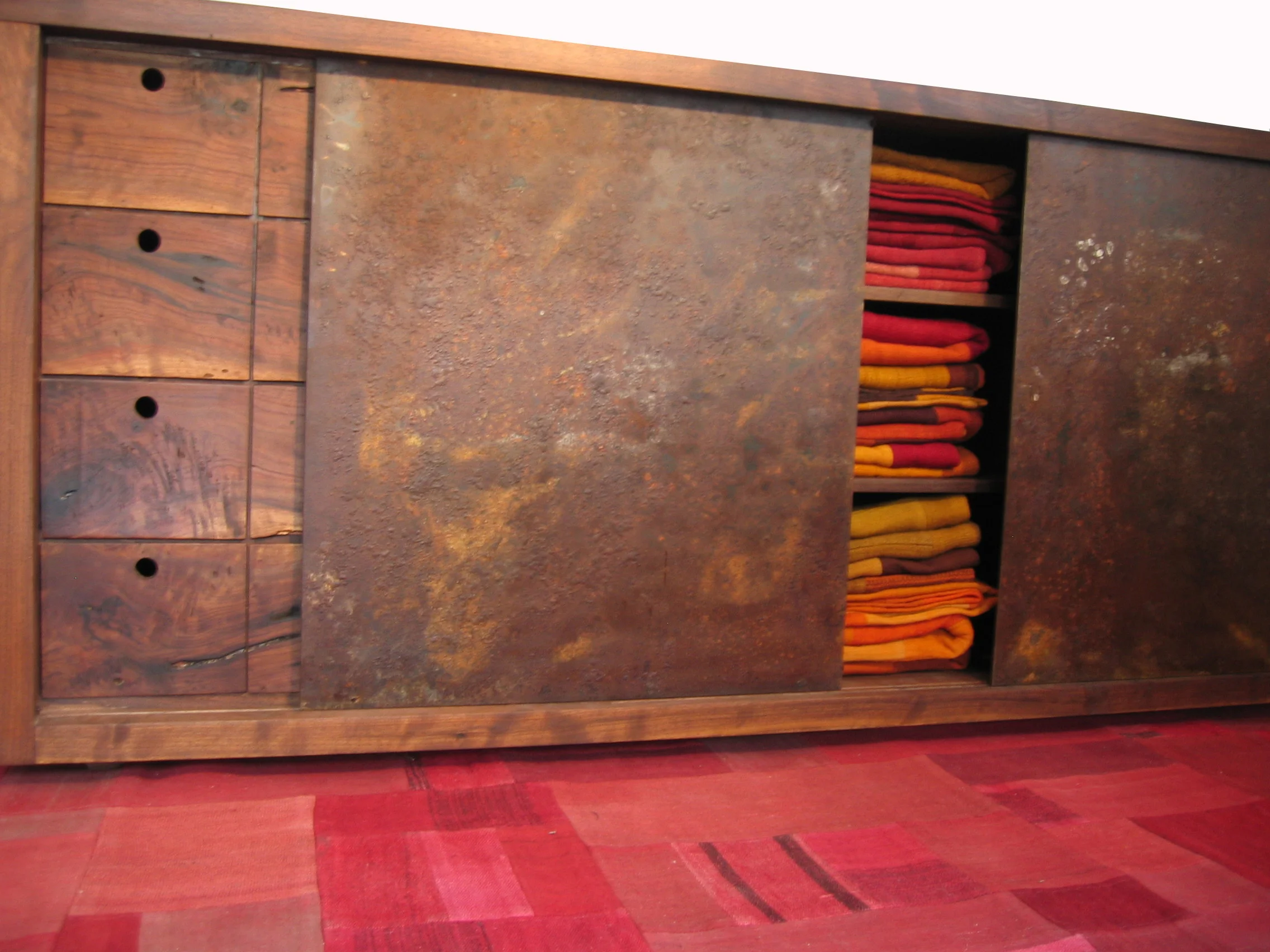 The Aaro Cabinet was created for a client with a large CD collection, but was also envisioned as an herb, spice and dried foods apothecary case. Aaron, an MHD favorite furniture maker, built this cabinet. His craftsmanship can be seen in the attention to detail; in the way the knots line up perfectly. No metal was used except on the reclaimed steel door, which was also made by hand.